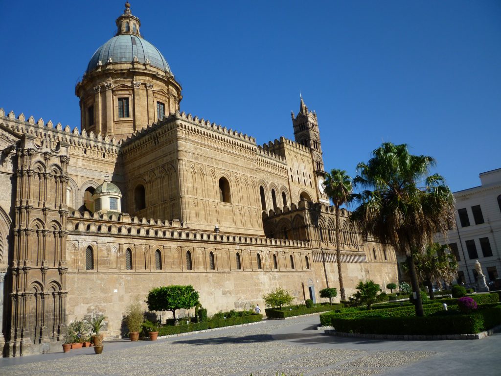 The cathedral was completed in 1185, towards the end of King William’s reign, and dedicated to the Assumption of the Virgin Mary. The site had long been used for a place of worship. First there was a Christian church on the site, followed by the Arabs’ grand mosque. When the Normans took Palermo in January 1072, the mosque was restored to a Christian church and handed over to the Greek archbishop, Nicodemus. The first cathedral built here by the Normans was linked to the Norman Palace by a street with porticoes called Via Coperta. An unusual touch is the inscription of a verse from the Qur’an, in Arabic, carved on the far left-hand column of the porch in front of the main entrance. Presumably this column was part of the material from the Arab’s grand mosque, reused when building the porch.